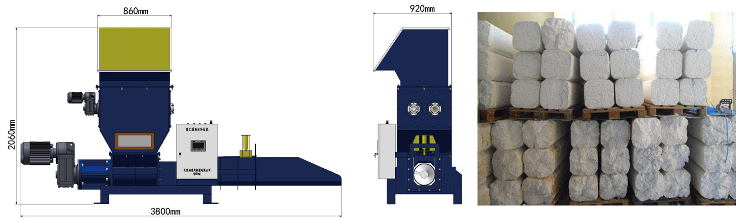 秦風機械的EPS泡沫冷壓機就是用來解決這個問題的,它可以減少EPS泡沫塑料材料的大小,壓縮比可以達到1:30-1: 50。壓縮的成品是EPS泡沫塑料塊,其密度可達250kg/m3,很容易把EPS泡沫塑料材料處理成另一種回收處理形態。